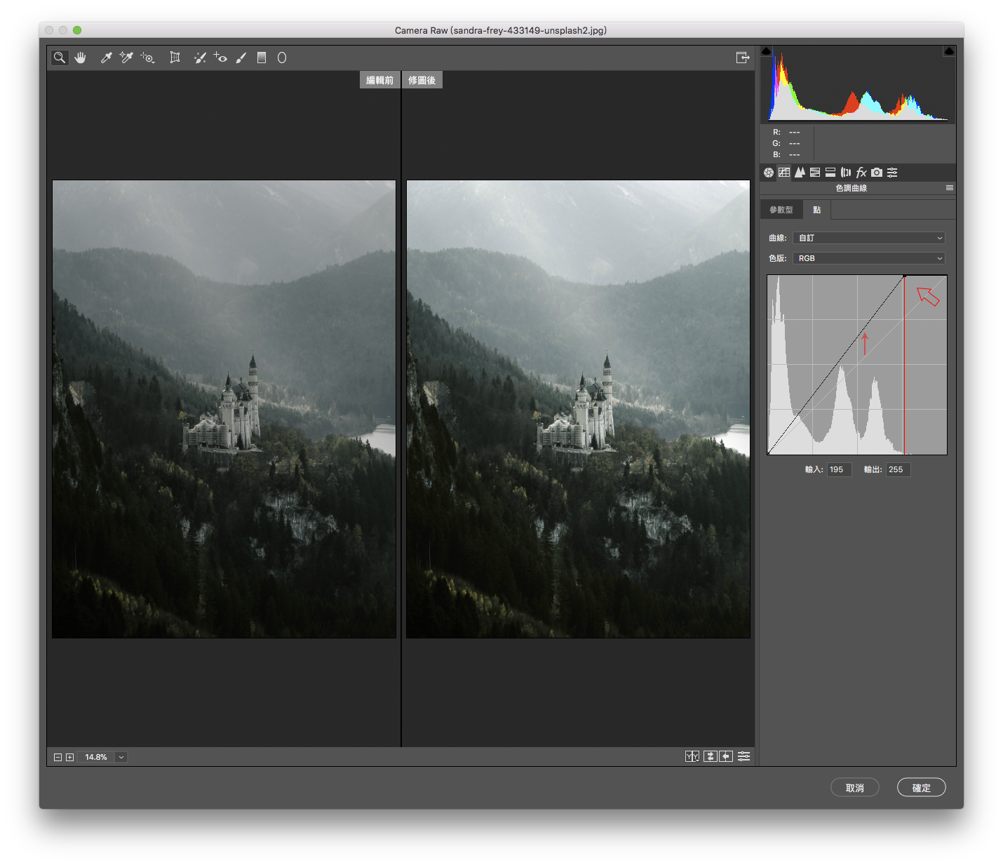剛開始講到了曲線後面還有著一張原始資訊的直方圖,在此就快速來講一下要怎麼使用它。